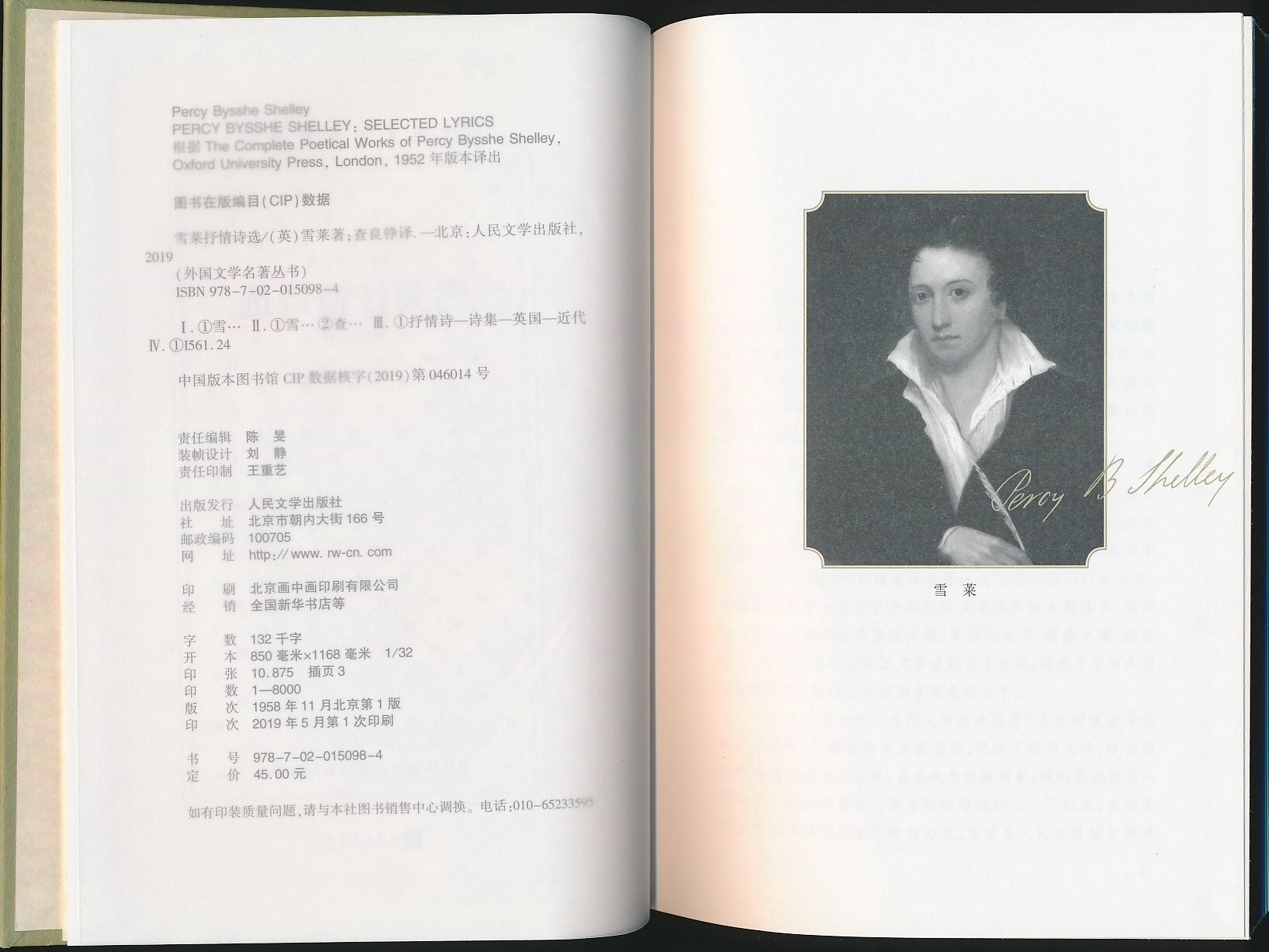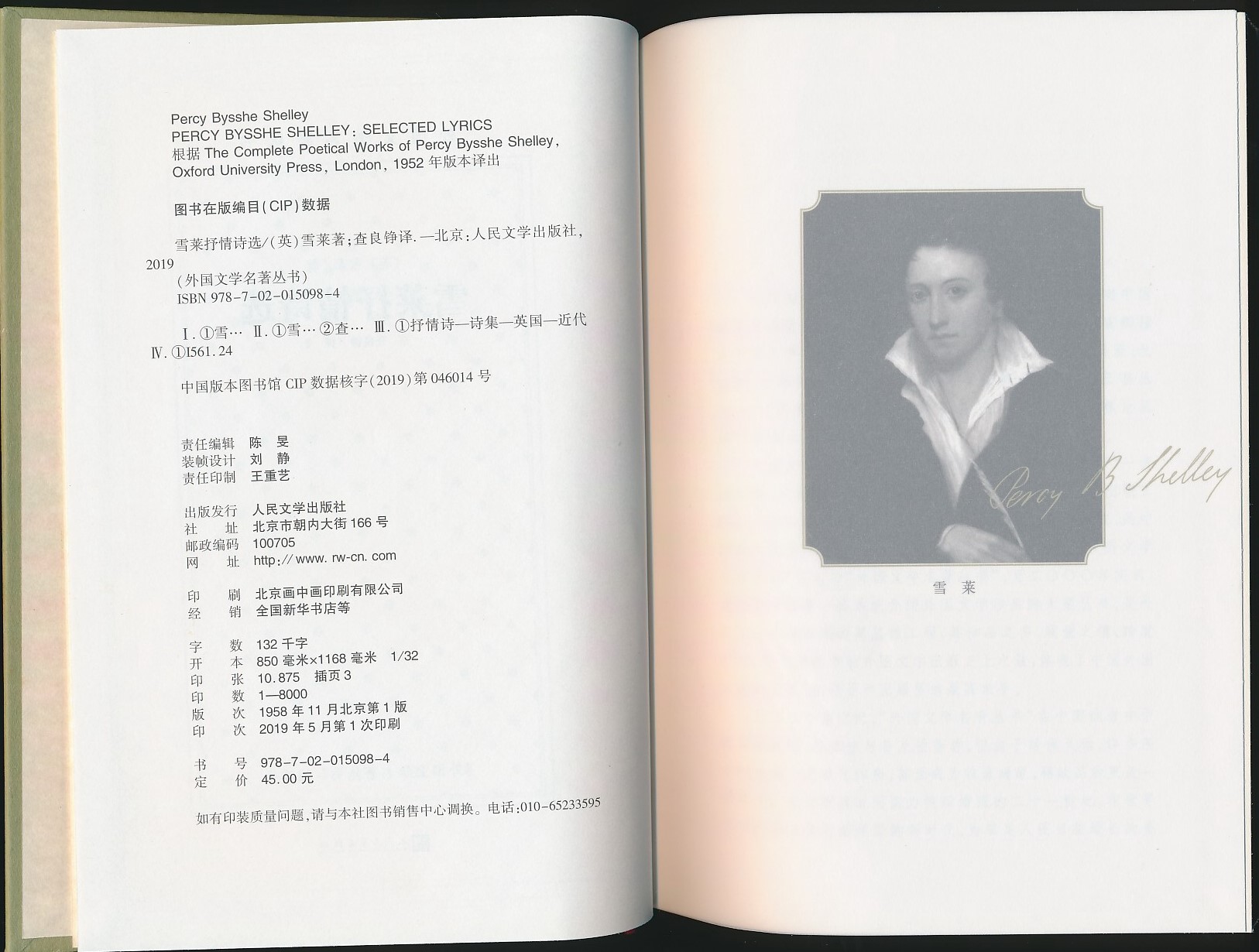 【网格本】雪莱抒情诗选(查良铮译·人文社2019年版·精装·定价45元·外国文学名著丛书)(9折包邮)