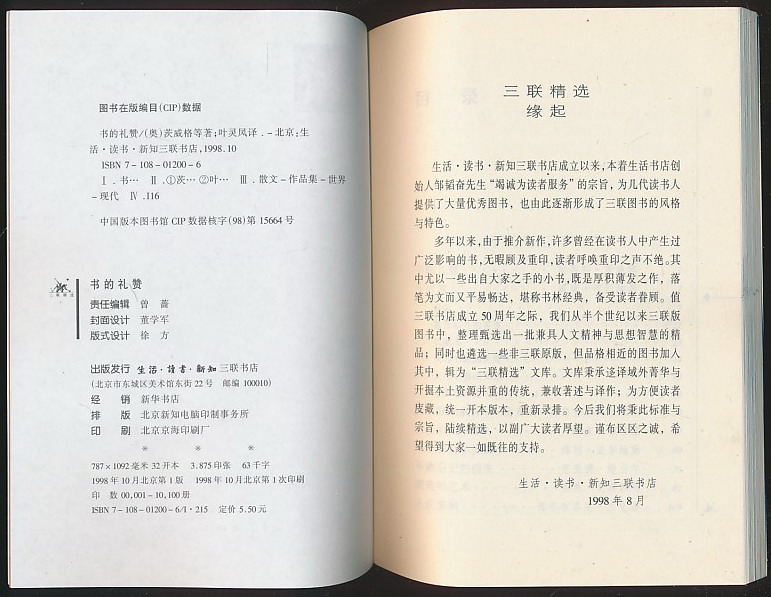 书的礼赞(茨威格等著·叶灵凤译·三联1998年版)